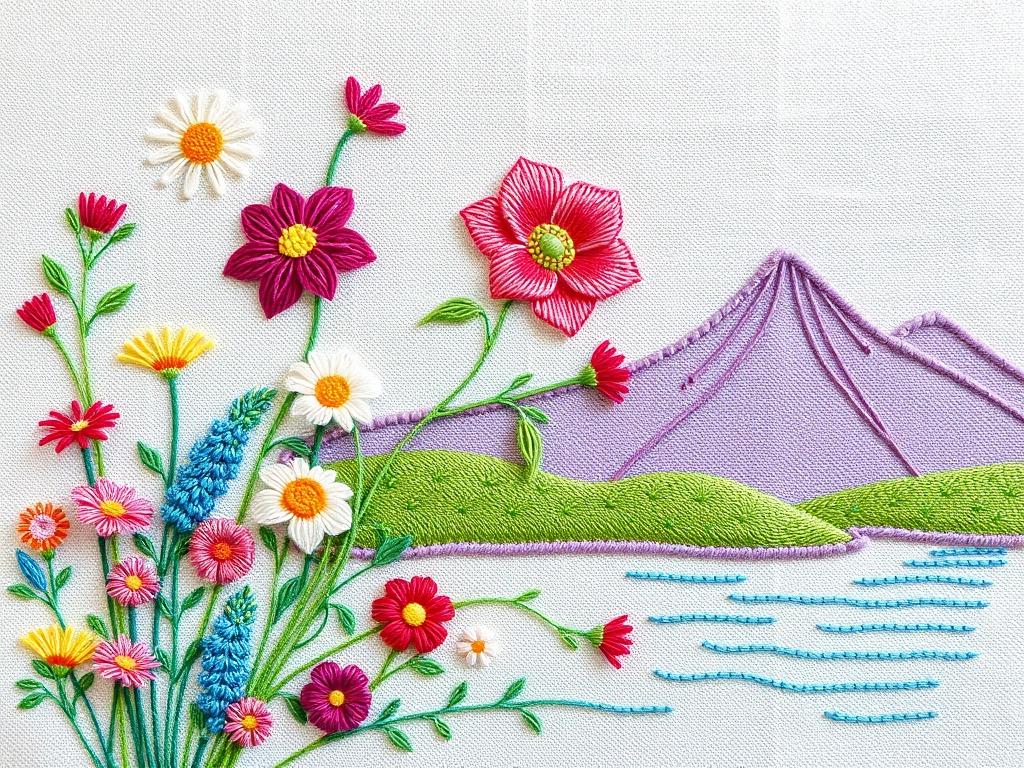 Небо передавайте длинными гладьевыми стежками в градациях голубого и голубовато-серого. Земля требует текстурности: сочетайте охру, коричневые и зеленые оттенки, добавляйте редкие штрихи травы и камней для глубины.